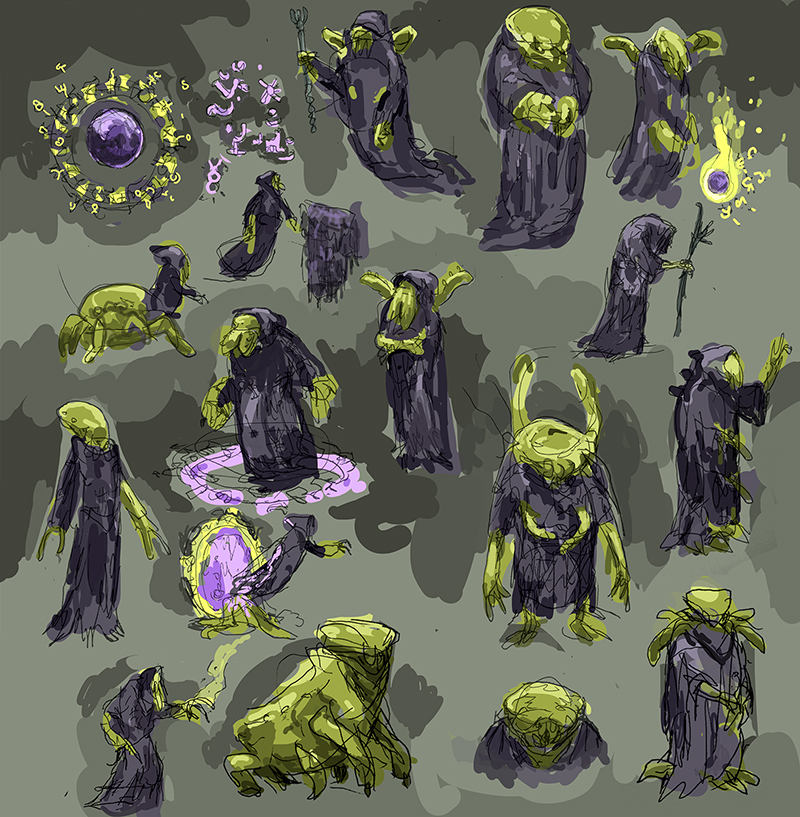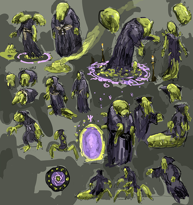 UPDATE: very WIP, I added some slimy tentacle piles to the loading bay that you can damage, destroy (not really sure the eventual gameplay, just messing around right now). Also started a new enemy that's floats around and if you distract it, it follow you and blows up (playing around in BP to see what I can do behavior wise) And I expanded the loading bay to double the size, make it more arena like. Player taking damage, hit reaction is up next. Sketches of more potential enemies, leaning into the Lovecraft-y style ancient beings:
