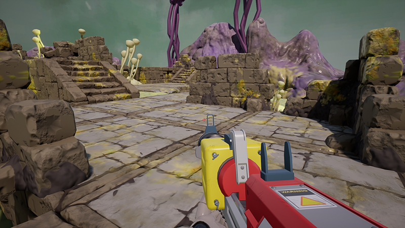 Update: I'm still messing around with the weapon designs, but decided to start throwing together a small FPS arena map, the Slime Fortress (lots of placeholder art, but the idea is fairly sketched in):