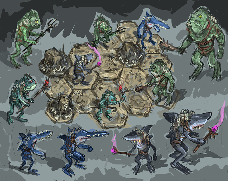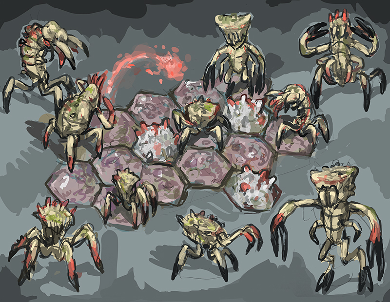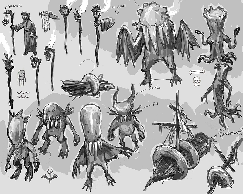 I haven't done much 'concept art' for Barnacle Squad, mostly just dozens and dozens of little quick thumbnail doodles. These usually get me close enough, then I just start building it in maya. Here are a bunch I brought into PS to add a little grayscale value: