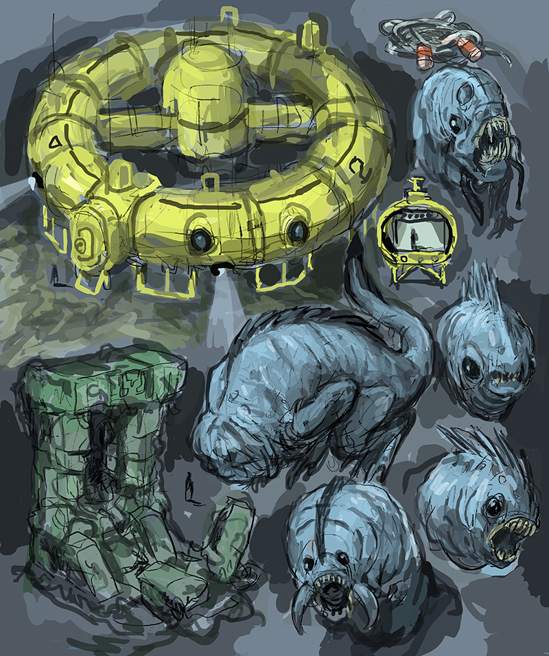 Ocean Prototype (personal project) Here' an old SUPER rough prototype I was kicking around a while back. I think there are some good bits in here (treasure hunting, using bait to distract enemies, sunken ruins!), and would love to dig back into this at some point. Screenshot above from an early UDK version, below is a not-great Unity test level w very placeholder content. Again, interesting concept that needs way more time in the oven, high-res assets, etc.