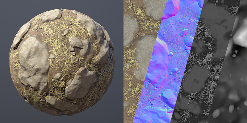 From my crab guys experiment, here's a bit more detail of the terrain material set-up.The terrain is an imported mesh from Maya, I'm using a 4 material PBR blend created with the Amplify shader editor. I use the RGB texture (below) to hold the masks between the 4 layers. Here's my work flow on 3 ground materials, the base meshes I start with (top), and the high-poly imported back from mudbox (bottom), ready for baking to textures in Maya.