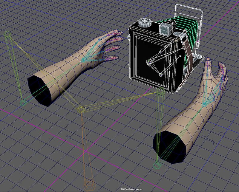 The camera parts are parented to a skeletal rig, and I created a quick arm model/rig with a some basic animation poses. The Camera is rigged separately, and parented to the arms in Unity, since I'm calling diffent animations for the arms and camera separately.